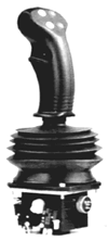 该控制手柄分左/右手控制型,主要应用于履带车辆的控制。前推(或后拉)动手柄可以改变行车方向,即向前推接通前进I档,向后拉接通倒车I档,中位为空档。可根据要求控制的档位数从两种之中选其一。一种是手柄正面有四个复位按钮的,四个按钮代表档位,可实现前进5档与后退5档,如要求R3时,档位选择逻辑单元可保证按下三档或其它档按钮时,都使系统均按三档执行。另一种手柄正面有六个复位按钮代表前进6档,后退6档。如选择R4时,档位选择逻辑单元也可保证按下四、五档或六档按钮时,系统均按倒四档执行。