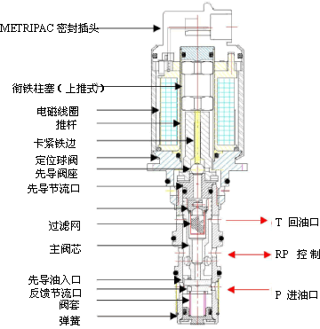 1、比例阀线圈不通电时,控制口的油通过主阀芯上的反馈节流孔进入弹簧腔,与弹簧共同作用,将阀芯推到最上端。主阀芯处于封死状态,P口和RP控制口不相通。