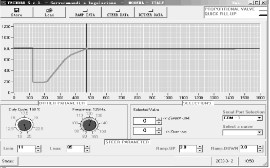 此软件在计算机上通过WINDOWS环境运行,并可将若干离合器的验证曲线传送到MPC4-PS编程控制器的EPROM中保存。使用该软件可对影响离合器接合时间至充油时间曲线的多种状态进行调整以达到工况要求的最佳工作状态,根据不同的挡位设置不同的曲线。一般存储有6-12条曲线(F3/R3为6条,F6/R6为12条)。各曲线的调整点可根据各种设备的容积参数及精度为6-12点,例如:T1(快速充油时间),T2(快速充油完成初始低压维持时间),T3、T4、