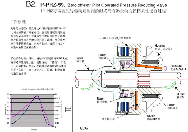 3、当比例阀线圈通入PWM电流信号时,衔铁柱塞产生一个与电流成正比的向下的推力,作用在推杆和定位球阀上,通过限制先导回油逐渐建立起球阀和主阀芯间先导腔的压力。限压:先导油须克服球阀的压力,将球阀顶开,才能流回油箱。建压:随着线圈电流增加,作用在球阀上的力增加,主阀芯上端的油压相应升高。该油压克服弹簧力将主阀芯向下推,进油口和控制口相通,先导油经P口和RP控制口流入离合器摩擦片的活塞腔。