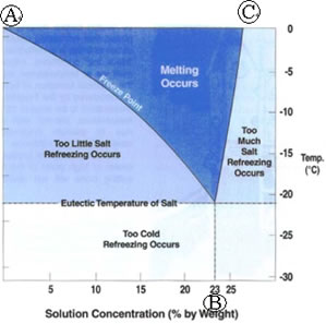 预湿融雪剂撒布作业,可以免除吸收热量和湿气的过程,直接产生融冰、化雪效果。通常,融雪剂预湿量为20-30%。当然,盐水中水的比例要严格控制。从下图中可以看出,水比例过低或过高都会使冰点上升。A线为水比例低于23%的冰点曲线,B线为23%是冰点,C线为水比例超过23%时冰点曲线。 |