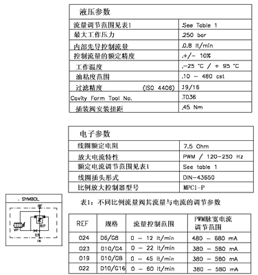 该阀为压力补偿、旁通型比例流量调节阀,内置电子控制放大板,闭环位移伺服控制,可根据DIN插头输入的电子摇杆(或调谐电位器)比例电压信号来比例调节FR口的流量。多余流量通过旁通油路BP口流回油箱。